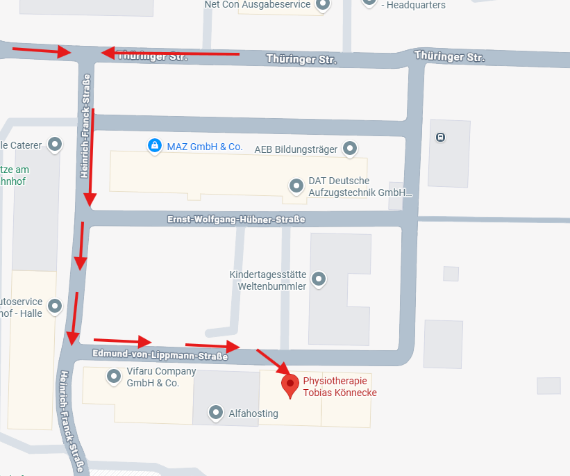 Mit den öffentlichen Verkehrsmitteln erreichen Sie mich am besten über die Haltestelle Heinrich-Schütz-Straße mit den Straßenbahnlinien 1, 2 und 5. Von dort nehmen Sie den Bus Nr. 30 bis zur Haltestelle Thüringer Straße.